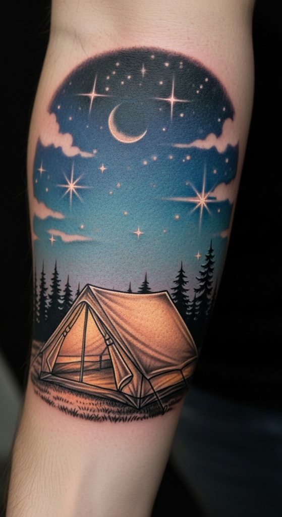 A small camping tent with stars overhead — captures the magic of the night sky and adventure in the wild.