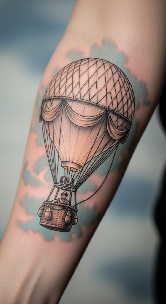 A vintage hot air balloon rising up the forearm — representing dreams, elevation, and freedom of spirit.