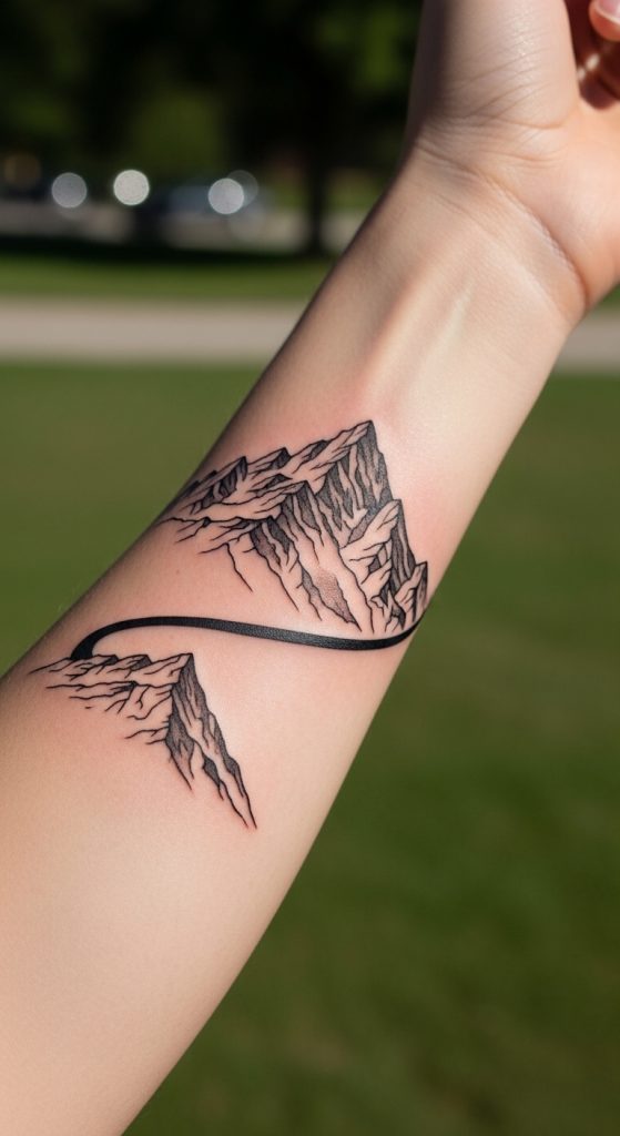 Simple black outline of mountains wrapping the forearm — clean, modern, and speaks to a love of nature.