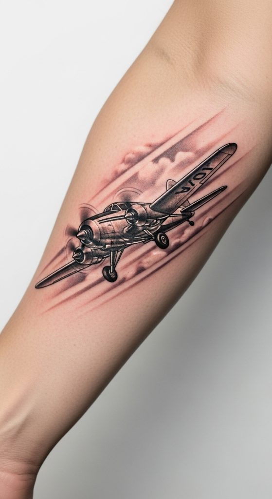 A small retro plane flying across the forearm — symbolizing freedom, travel, and adventure.