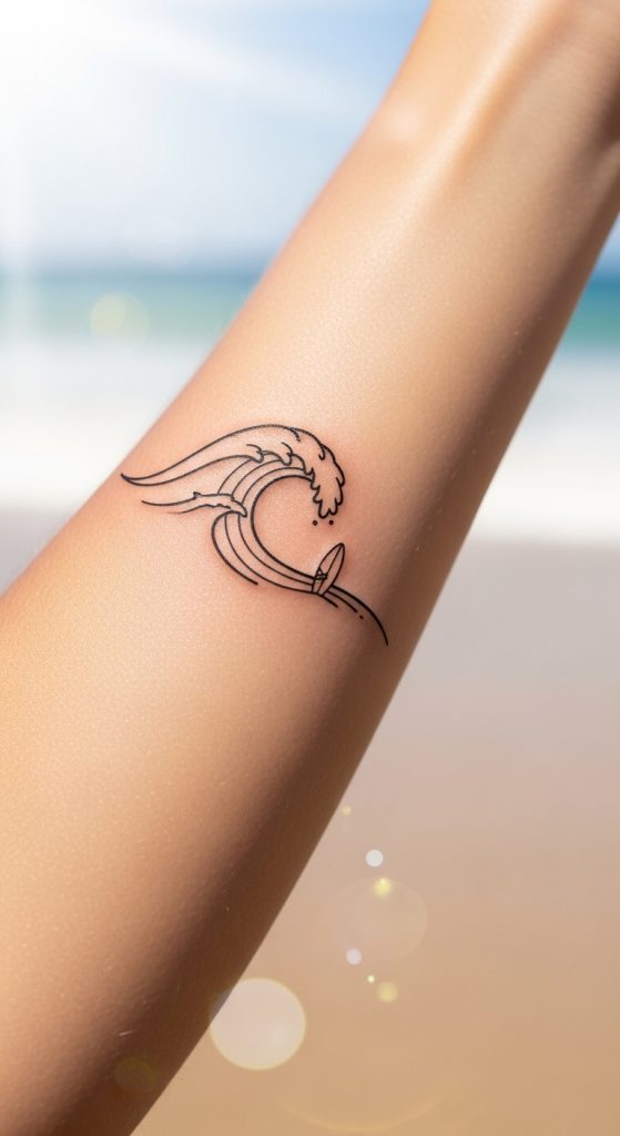 Minimalist wave tattoo with a tiny surfboard — ideal for ocean lovers and surfers.