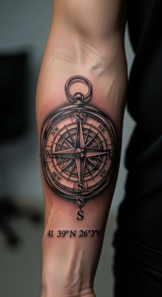 Symbolizes direction and purpose. Pair a classic compass with the coordinates of a place that changed your life — perfect for the inner forearm.