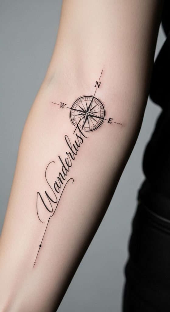 Simple script “Wanderlust” combined with a small compass, feather, or arrow — a subtle nod to your adventurous heart.